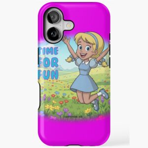 Honey Dee, Time for Fun, Happy jumping girl, Cute cartoon girl, Retro 80s cartoon, Colorful flower field , Joyful cartoon, Kids cartoon character, Positive vibes ,Wholesome illustration